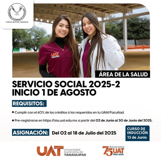 ¡Atención estudiantes del área de la salud! Si ya cumpliste con al menos el 60% de los créditos o los requisitos establecidos por tu UAM o Facultad, deberás realizar el pre-registro para el Servicio Social a partir del 2 de junio de 2025 en: https://siss.uat.edu.mx.