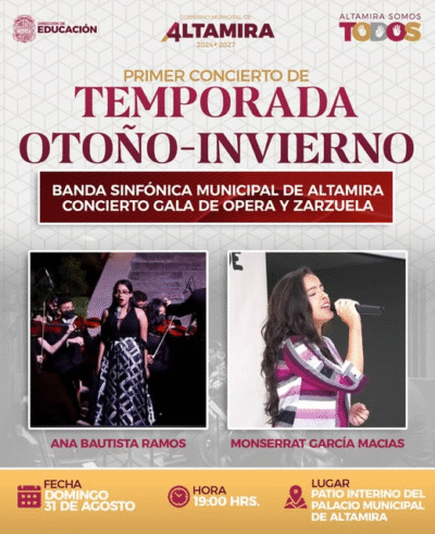 Disfruta de una tarde espectacular en familia con la presentación del Primer Concierto de Temporada Otoño-Invierno, interpretado por la Banda Sinfónica de Altamira.