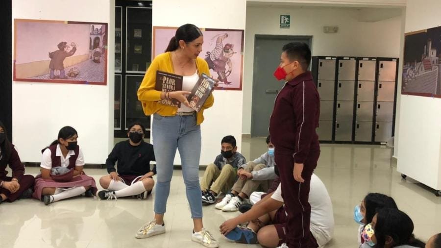 Alumnos de la primaria José María Pino Suárez fueron los primeros asistentes a la exhibición del libro “La peor señora del mundo” en la biblioteca municipal Amalia G. Caballero de Castillo Ledón ubicada en la plaza principal.