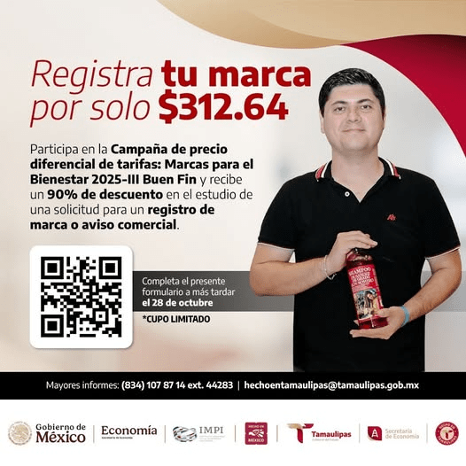 El Instituto Mexicano de la Propiedad Industrial, en coordinación con el programa Hecho en Tamaulipas de la Secretaría de Economía, invita a aprovechar la campaña “Marcas para el Bienestar 2025-III Buen Fin”, ofreciendo un 90% de descuento en el estudio de solicitud nacional para el registro de una marca, aviso comercial o nombre comercial.