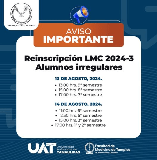 Aviso importante para reinscripción LMC 2024-3 de alumnos irregulares que serán el 13 y 14 de agosto Navegación de entradasHorario de ClasesSeguimiento Egresados