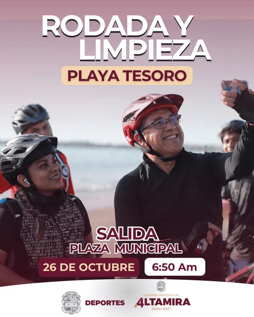 Este sábado 26 de octubre te invitamos a que nos acompañes a hacer deporte con la rodada ciclista, partiendo desde la Plaza «Constitución» del centro de la ciudad a las 6:50 AM hacia nuestra Playa Tesoro en donde realizaremos una jornada de limpieza. ¡Anímate a acompañarnos!