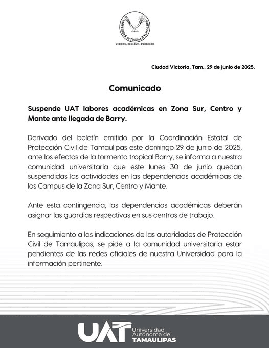 Debido a las condiciones climatológicas provocadas por la tormenta tropical Barry, la UAT suspende actividades académicas este lunes 30 de junio en los campus de las zonas Sur, Centro y Mante.