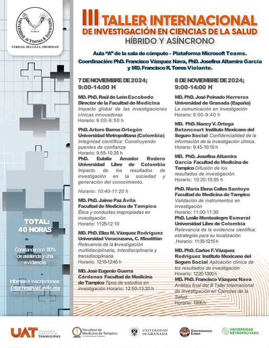 Extendemos una cordial invitación al Taller Internacional de Investigación en Ciencias de la Salud en el cual se abordarán temas de impacto en el área médica y clínica ![]()