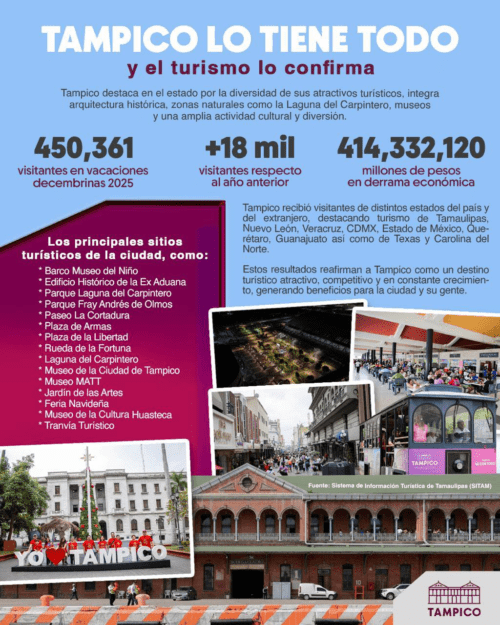 Tampico lo tiene todo, y el turismo así lo demuestra. Nuestra ciudad sobresale por su riqueza cultural, natural e histórica, consolidándose como un destino atractivo para visitantes de todas partes. Durante las vacaciones decembrinas de 2025, recibimos a 450,361 turistas, lo que representa 18 mil más que el año anterior y una derrama económica de 414,332,120 millones de pesos.