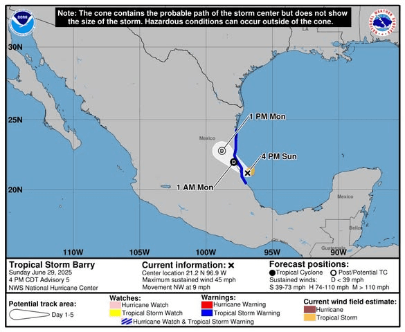 La tormenta tropical Barry se encuentra muy cerca de la costa mexicana, con vientos sostenidos de 75 km/h y ráfagas de hasta 90 km/h. Actualmente, se ubica a 150 km al sureste de Tampico y se espera que toque tierra esta noche en algún punto del norte de Veracruz.