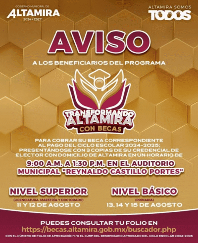 El Gobierno de Altamira hace un llamado a todos los beneficiarios del programa Transformando Altamira Con Becas para que consulten su folio en: https://becas.altamira.gob.mx/buscador.php.